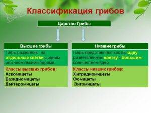 Грибы можно разделить на низшие и высшие. Низшие грибы, как правило, представлены микроскопическими организмами, такими как плесень и дрожжи. Высшие грибы, в свою очередь, включают все остальные виды грибов, от макромицетов до базидиомицетов и аскомицетов.