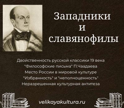 Культурная концепция Чаадаева таила в себе внутреннее противоречие, поскольку основывалась одновременно и на идее «избранности», и на мысли о «национальной неполноценности». Именно поэтому, подхваченная другими авторами, в 40-е годы она распадается на западническое и славянофильское течение. В основу новой антитезы легли попытки сравнения России с Западом и размышления всё о той же русской «неполноценности» или «избранности». Невзирая на различия в риторике западников, настаивавших на «вливании» в мировую культуру, и славянофилов, говоривших об исключительности, налицо были и явные сходства. Оппоненты единогласно отмечали «выделенность» отечественной культуры в общем культурном многообразии, хотя и усматривали её причины в разных вещах – в прогрессе, отсталости, традиционности или самобытности. Представители враждующих лагерей были едины и в стремлении избавиться от культурного разрыва с Западом. Любовь к русскому была одной, но не одинаковой, как писал А. Герцен.