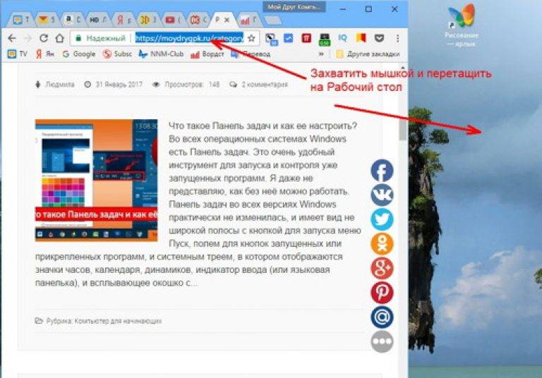 Для страниц в Интернете можно не заниматься копированием адреса. Достаточно просто его выделить и при нажатой левой кнопке мыши перетащить в нужное расположение. Но окно браузера придется уменьшить.