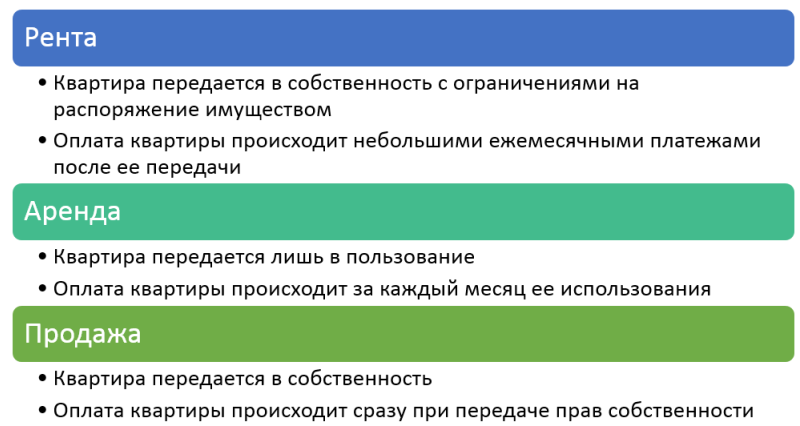- При ренте же выплаты денег происходят единоразово (чаще всего в начале срока использования объекта), и далее за каждый месяц (квартал) проживания ничего не нужно будет выплачивать — сумма уже уплачена.