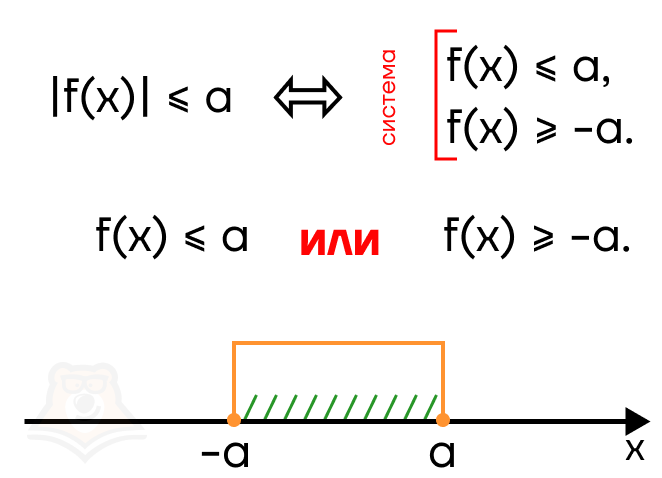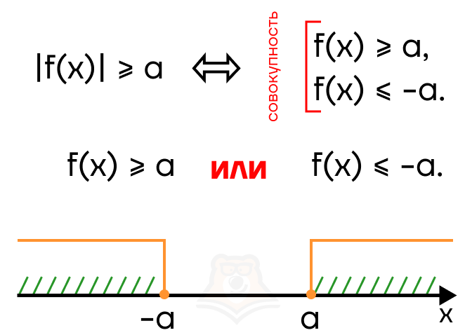 Рассмотрим неравенства вида |f(x)| > a и |f(x)| < a, где а — некоторое число и a >= 0. Модуль можно раскрыть двумя способами и получить два неравенства. Но будет это совокупность или система?