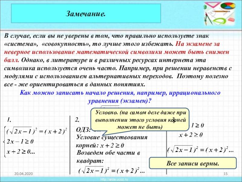 Замечание. В случае, если вы не уверены в том, что правильно используете знак «система», «совокупность», то лучше этого избежать. На экзамене за неверное использование математической символики может быть снижен балл. Однако, в литературе и в различных ресурсах интернета эта символика используется очень часто. Например, при решении неравенств с модулями с использованием альтернативных переходов. Поэтому полезно все – же ориентироваться в данных понятиях. Как можно записать начало решения, например, иррационального уравнения (экзамен)? ОДЗ: Условие существования корней: Возведем обе части в квадрат: Условно. (на самом деле даже при выполнении этого условия корней может не быть) Все записи верны.