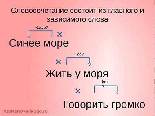Словосочетание состоит из двух частей: главного слова и зависимого. Они связаны между собой по смыслу. Эта связь называется подчинительной, поскольку одно слово зависит от другого. Смысловая связь устанавливается по вопросу, который задается от главного слова к зависимому.