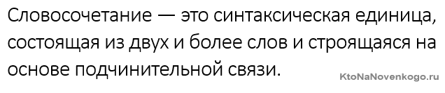 Словосочетание – это соединение нескольких (двух или более) самостоятельных слов, которые грамматически и по смыслу связаны друг с другом и служат для расчленённого обозначения единого понятия (им может быть предмет, его качество или свойство, действие и др.).