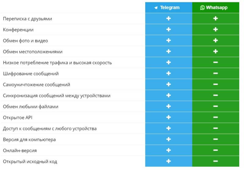 Хорошо, для тех, кто всё ещё сомневается, что лучше – «Telegram» или «WhatsApp», ещё одна сравнительная таблица, где к сравнению применяется функциональная разница и не только те отличия, которые были рассмотрены выше, но и другие, довольно интересные различия: