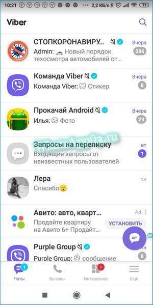 В своем интерфейсе Вайбер использует белые и фиолетовые тона. На главном экране расположены последние переписки. В нижней части можно увидеть панель управления и клавишу для нового чата.
