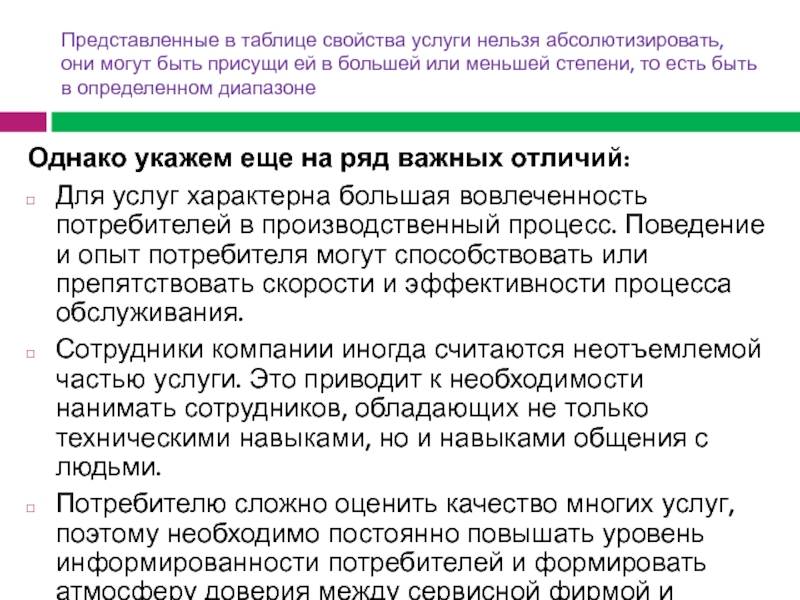Слайд 4Представленные в таблице свойства услуги нельзя абсолютизировать, они могут быть