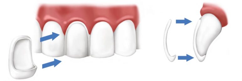 - если коронка закрывает весь зуб, охватывая его по шейке зуба, то винир устанавливается поверх зуба только на его передней поверхности;