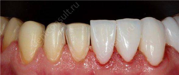 - Компониры показаны для коррекции 1-2 зубов. Исправление формы и цвета группы зубов должно проводиться с помощью ламинирования керамическими микропротезами.