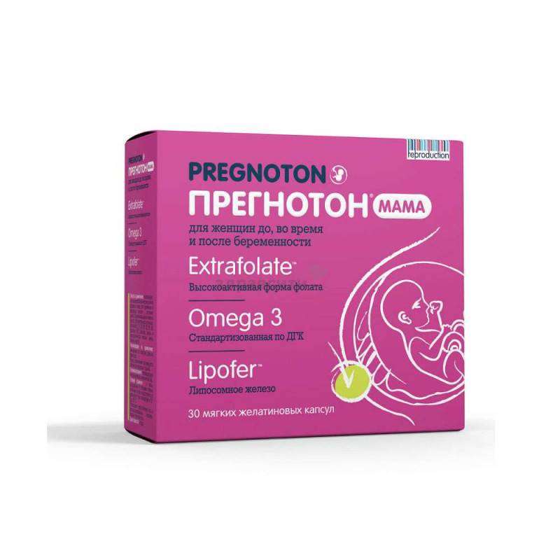 Открывают наш обзор витамины для беременных Прегнотон мама. Это сбалансированный мильтивитаминный комплекс от чешского производителя Аквион. В лабораториях компании потрудились и создали препарат, состоящий из «удобных» для организма нутриентов. Они легко и эффективно усваиваются, не вызывая негативной реакции. В состав входит Extrafolate – фолаты (одна из формул фолиевой кислоты). Они хорошо усваиваются даже у тех женщин, которые испытывали дефицит «фольки» из-за плохого ее всасывания, а не недостатка в продуктах. Также здесь есть липосомное железо, которое усваивается почти на 100%, усиленная доза жирных кислот (Омега-3 в виде активной докозагексаеновой кислоты (ДГК), 200 мг) и 15 различных витaминов и минералов в дозировках, закрывающих потребности беременной в этих веществах. Среди прочих микроэлементов, комплекс содержит 150 мкг йода (это суточная потребность в норме), поэтому желательна консультация врача перед применением. Благодаря улучшенной формуле, данные витaмины помогут в лечении анемии беременной, т.к. железо здесь хорошо усваивается, не создавая нагрузки на ЖКТ. В составе нет виaамина А, который рекомендован не на всех сроках беременности, что делает данный препарат универсальным, подходящим всем будущим мамам.