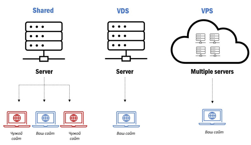 Поскольку отличий между VPS и VDS нет, стоит углубиться в суть услуги, а также сравнить её с другими предлагаемыми вариантами размещения сайта.