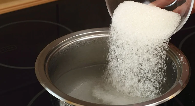 - В кастрюлю высыпаю сахарный песок, добавляю воды и ставлю на небольшой огонь, до тех пор, пока сахарный песок полностью не растворится.