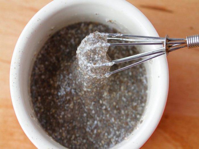 - В сочетании с водой, семена чиа образуют густой гель, который по текстуре аналогичен сырым яйцам. Они не имеют запаха и редко изменяют текстуру теста, что положительно сказывается на нежных и легких пирожных (1 ст. л. семян в сочетании с 3 ст. л. теплой воды равны 1 яйцу).