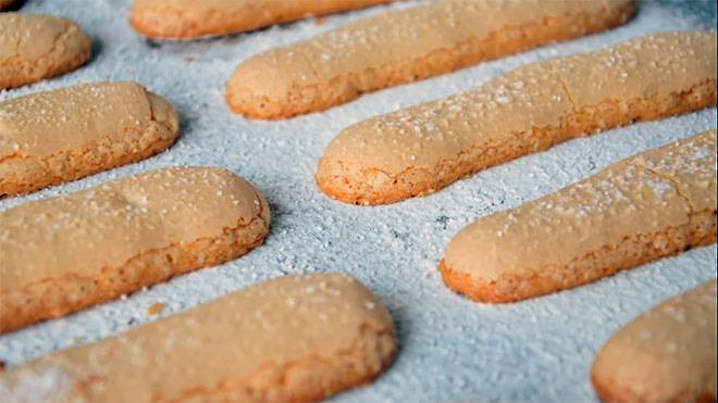 Для этого рецепта вам понадобятся яйца, сахар, мука и разрыхлитель. Взбейте яйца с сахаром до образования пышной массы. Добавьте просеянную муку и разрыхлитель и нежно перемешайте. С помощью кондитерского мешка или печеньяницы сформируйте палочки на противне, покрытом бумагой для выпечки. Выпекайте палочки в разогретой до 180 градусов духовке до готовности. Остуженные бисквитные палочки готовы к использованию в тирамису.