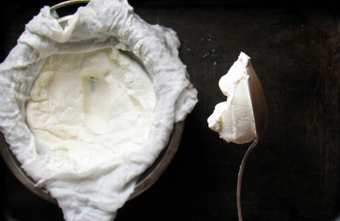 , тебе понадобится обычный кефир 9%-й жирности или простокваша. Помести кефир в полиэтиленовый пакет и заморозь его. Через 8–12 часов достань замороженный пакет, разрежь его и выложи содержимое на дуршлаг, застеленный несколькими слоями марли. Дуршлаг помести в кастрюлю, чтобы стекала молочная сыворотка.