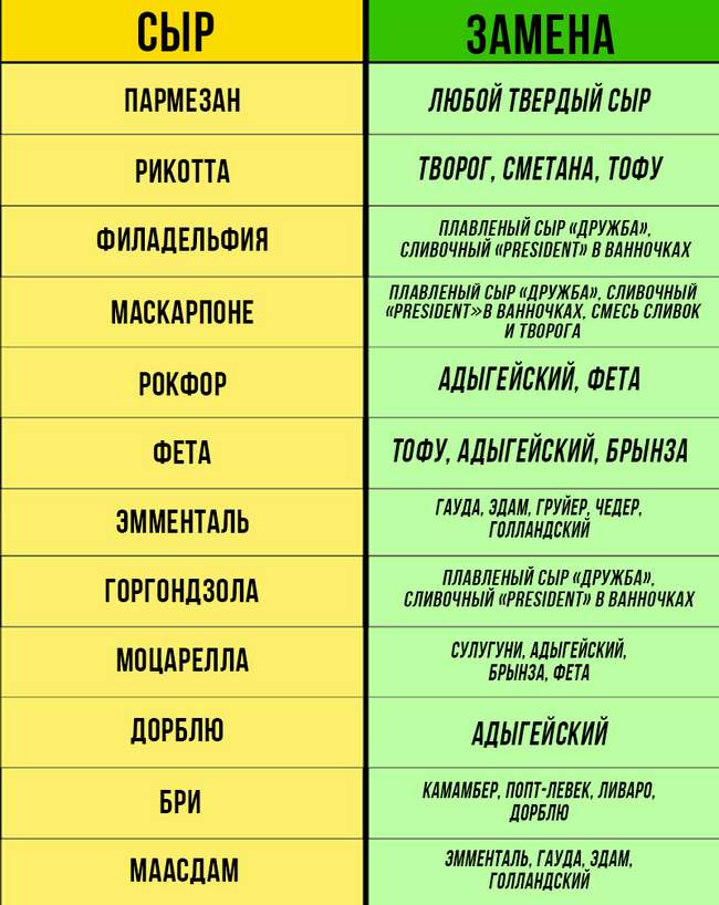 Конечно, те, у кого хватает средств на пармезан, рикотту и маскарпоне, сочтут эту замену неэффективной. Да и гурман, отлично знающий вкус элитного сыра, сразу заметит подмену. Тем не менее блюда, приготовленные с доступными аналогами, скорее всего, окажутся вкусными и мало чем отличающимися от оригинала. Итак, давай экспериментировать!