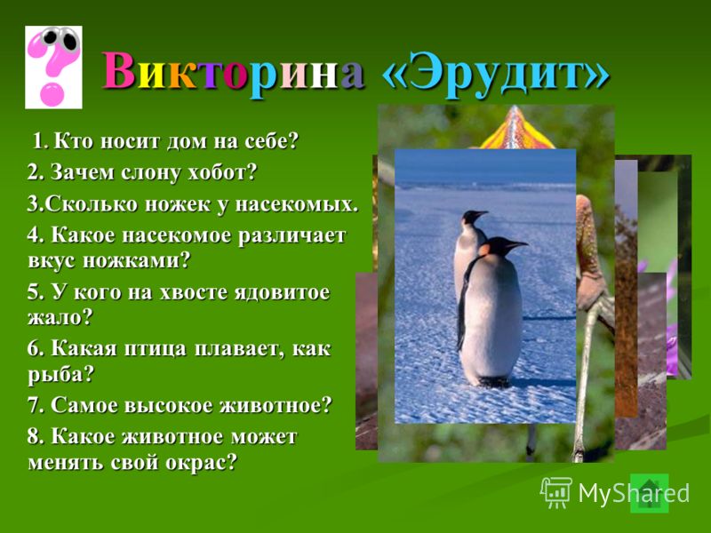 Викторина «Эрудит» 1. Кто носит дом на себе? 1. Кто носит дом на себе? 2. Зачем слону хобот? 3.Сколько ножек у насекомых. 4. Какое насекомое различает вкус ножками? 5. У кого на хвосте ядовитое жало? 6. Какая птица плавает, как рыба? 7. Самое высокое животное? 8. Какое животное может менять свой окрас?