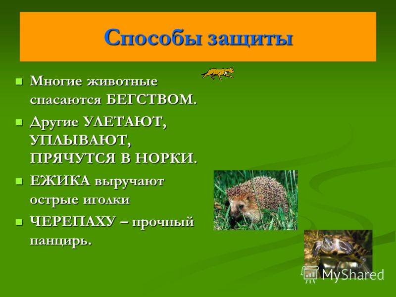 Способы защиты Многие животные спасаются БЕГСТВОМ. Многие животные спасаются БЕГСТВОМ. Другие УЛЕТАЮТ, УПЛЫВАЮТ, ПРЯЧУТСЯ В НОРКИ. Другие УЛЕТАЮТ, УПЛЫВАЮТ, ПРЯЧУТСЯ В НОРКИ. ЕЖИКА выручают острые иголки ЕЖИКА выручают острые иголки ЧЕРЕПАХУ – прочный панцирь. ЧЕРЕПАХУ – прочный панцирь.