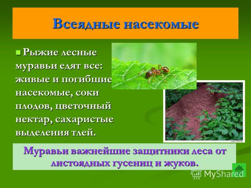 Всеядные насекомые Рыжие лесные муравьи едят все: живые и погибшие насекомые, соки плодов, цветочный нектар, сахаристые выделения тлей. Рыжие лесные муравьи едят все: живые и погибшие насекомые, соки плодов, цветочный нектар, сахаристые выделения тлей. Муравьи важнейшие защитники леса от листоядных гусениц и жуков.