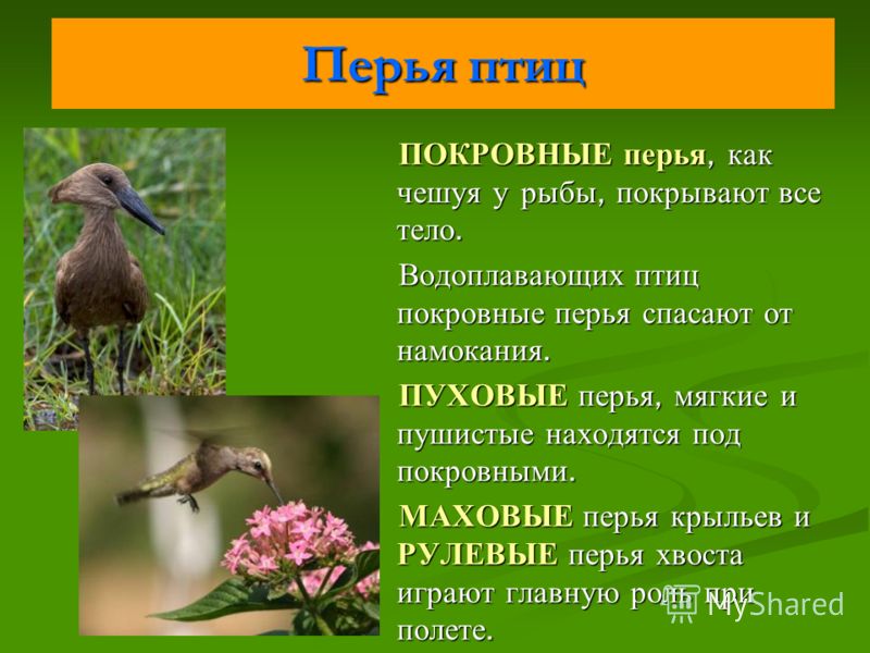 Перья птиц ПОКРОВНЫЕ перья, как чешуя у рыбы, покрывают все тело. Водоплавающих птиц покровные перья спасают от намокания. ПУХОВЫЕ перья, мягкие и пушистые находятся под покровными. МАХОВЫЕ перья крыльев и РУЛЕВЫЕ перья хвоста играют главную роль при полете.