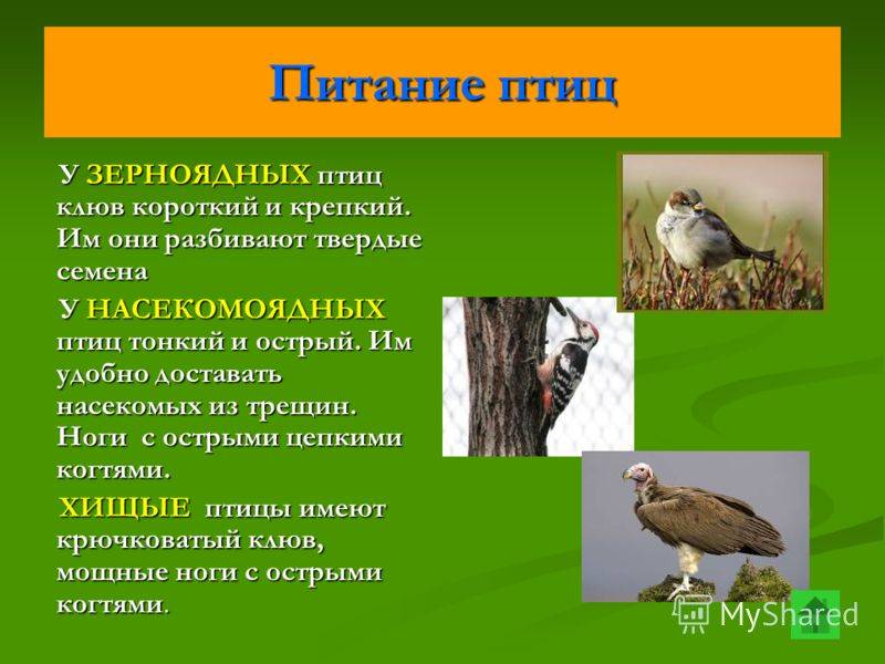 Питание птиц У ЗЕРНОЯДНЫХ птиц клюв короткий и крепкий. Им они разбивают твердые семена У НАСЕКОМОЯДНЫХ птиц тонкий и острый. Им удобно доставать насекомых из трещин. Ноги с острыми цепкими когтями. ХИЩЫЕ птицы имеют крючковатый клюв, мощные ноги с острыми когтями.