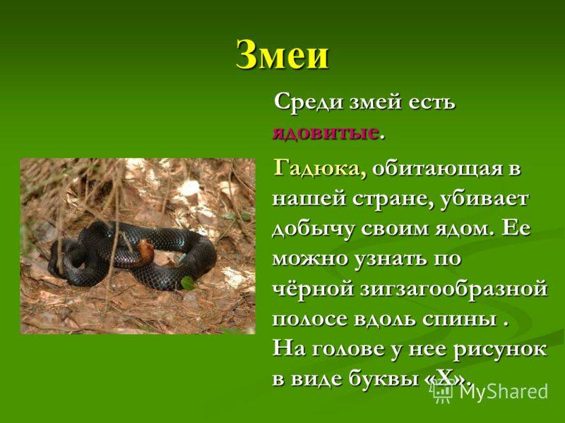 В нашей фауне из ядовитых змей чаще всего встречается гадюка. Днем она греется на солнце, а ночью ловит добычу: мышей, птенцов, лягушек, даже насекомых.