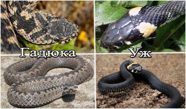 Из неядовитых змей в природе часто можно встретить ужа, которого иногда путают с гадюкой. Уж – это рептилия, длиной до 1м, черного цвета с полукруглыми желтыми пятнами на голове. Отличие двух змей хорошо просматриваются на рисунке.
