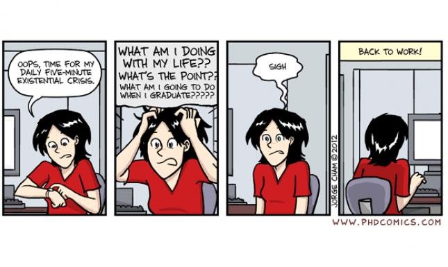 Постоянное ощущение, что ты тупой и рисеч твой ничего не стоит, а диссер пишется в стол (а если защищаться по классической схеме, он реально пишется в стол, важны только крутые статьи, но не диссер). Даже в аспирантуре модной (на 2013 год) Вышки все равно не избежишь “атмосферы НИИ”, когда дойдет до защиты – чай “Корона российской империи”, деды в свитерах, гранты РФФИ. Какие-то никому не нужные проекты тащатся и все делают вид, что они реально что-то значат. Даже на аспирантских семинарах, где мы делились, кто над чем работает, меня не покидало ощущение, что собрались умные лузеры. Более того, мне казалось, что у других ощущение ровно то же было. Предположу, что на позициях postdoc и выше ощущение лузерства еще и усугубляется необходимостью “стоять с протянутой рукой”, то есть выбивать деньги на свои исследования. В-общем, мне запомнились слова бодренького француза, коллеги в Вышке: ”You are never happy doing your Ph.D”.