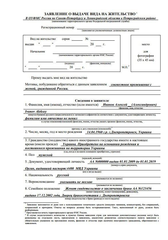 Образец заявления на получение ВНЖ: