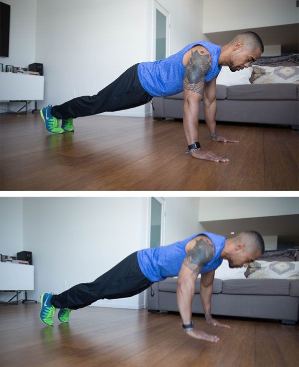 Вы можете дать своему телу и изометрическую нагрузку. Начните отжимание на предплечьях в позиции планки вместо традиционной позы на ладонях. Выйдите из позиции планки, подняв сначала одну, затем вторую руку. Когда вы перешли в позицию высокой планки (на ладонях), опуститесь назад, положив руки на предплечья.