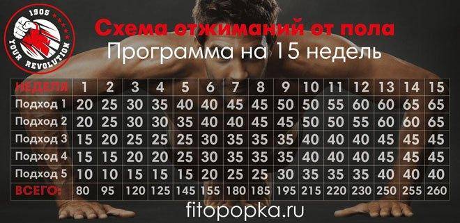 Программа увеличения количества отжиманий для начинающих за 15 недель.