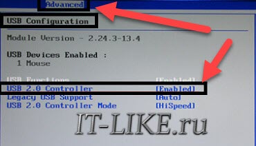 Если порты USB в принципе не работают, то есть смысл войти в БИОС и проверить включены ли они там. В разных версиях BIOS и UEFI настройка по включению/отключению ЮСБ-портов будет находиться в разных местах, нужно походить по меню, обычно это пункт «Advanced -> USB Configuration». Необходимо переключить свойство «USB 2.0 Controller» и «USB 3.0 Controller» (если есть) в состояние «Enabled»: