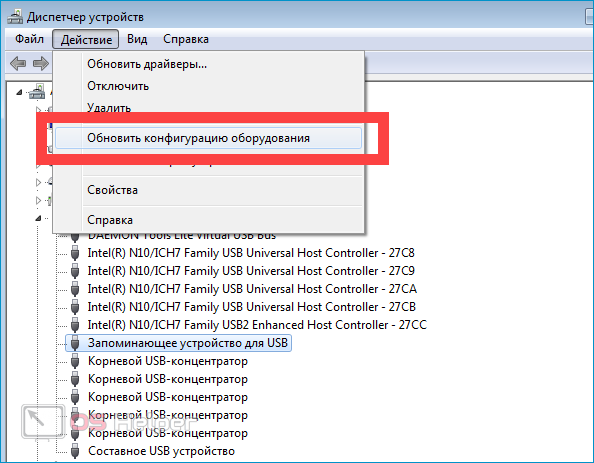 - Отключаем флешку, подключаем её снова. Даём системе время на обнаружение и установку свежих версий драйверов.