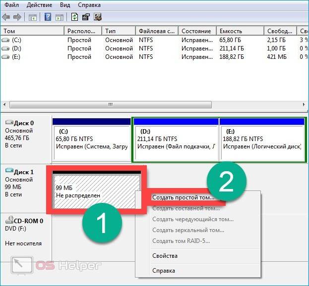 - Кликнуть правой кнопкой по блоку «Не распределён», выбрать вариант «Создать простой том». Согласиться на запуск «Мастера создания простых томов». Пропустить страницу «Указание размера» — утилита автоматически выставит максимальный объём.