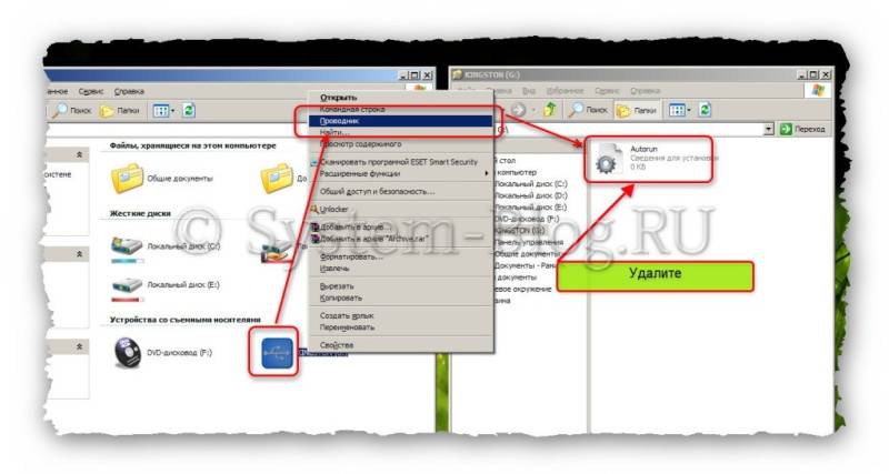 Во втором случае можно попробовать попасть на флешку через проводник Windows, кликнув по иконке накопителя правой кнопкой мышки и выбрав «Проводник». Если вам повезло, и флешка открылась, то попытайтесь найти там файл «autorun.inf» и удалить его. Затем необходимо проверить флешку на вирусы, и потом можно открывать её и пользоваться. Если это не помогло, можно попробовать удалить другие файлы, которые кажутся вам подозрительными, которых точно не было на вашей флешке.