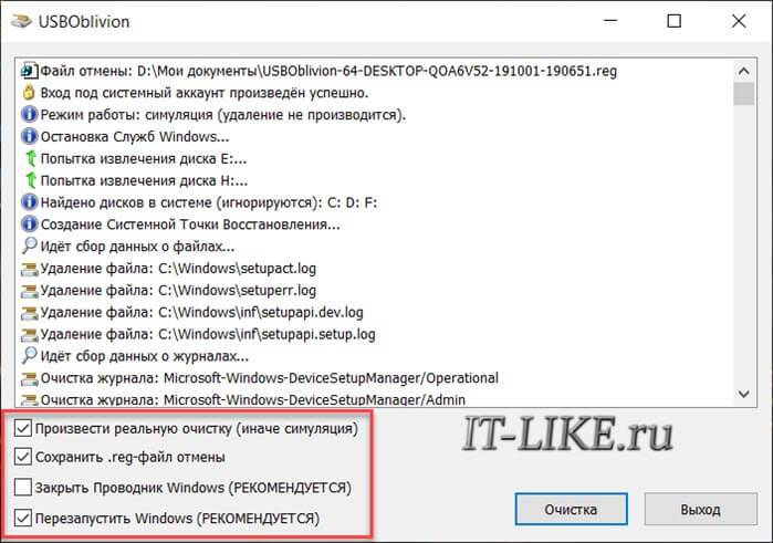 Нажмите «Очистка» и дождитесь окончания процесса удаления старых драйверов. В процессе чистки будет создана контрольная точка восстановления Windows, благодаря ей вы сможете восстановить состояние системы на момент как до запуска USB Oblivion. Также будет сохранён «reg-файл», т.е. удалённые ветки реестра. Для восстановления прежнего состояния реестра нужно просто запустить файл «.reg» и согласиться с внесением изменений в реестр Windows.