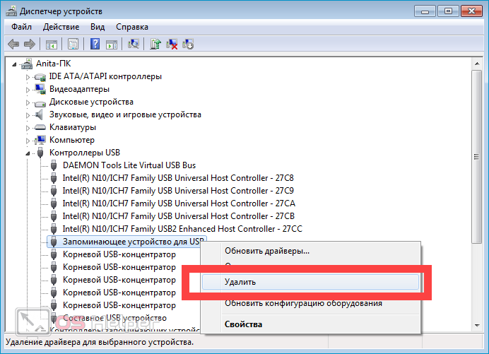 - Кликаем правой кнопкой по пункту «Запоминающее устройство для USB», жмём на «Удалить». Эта операция позволит избавиться от текущих драйверов накопителя.