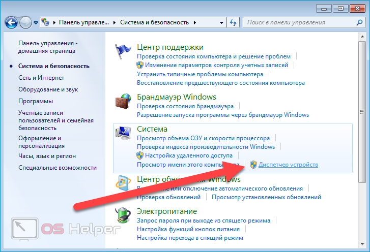 - Открываем «Пуск», переходим в «Панель управления», раскрываем раздел «Система и безопасность», перемещаемся в «Диспетчер устройств».
