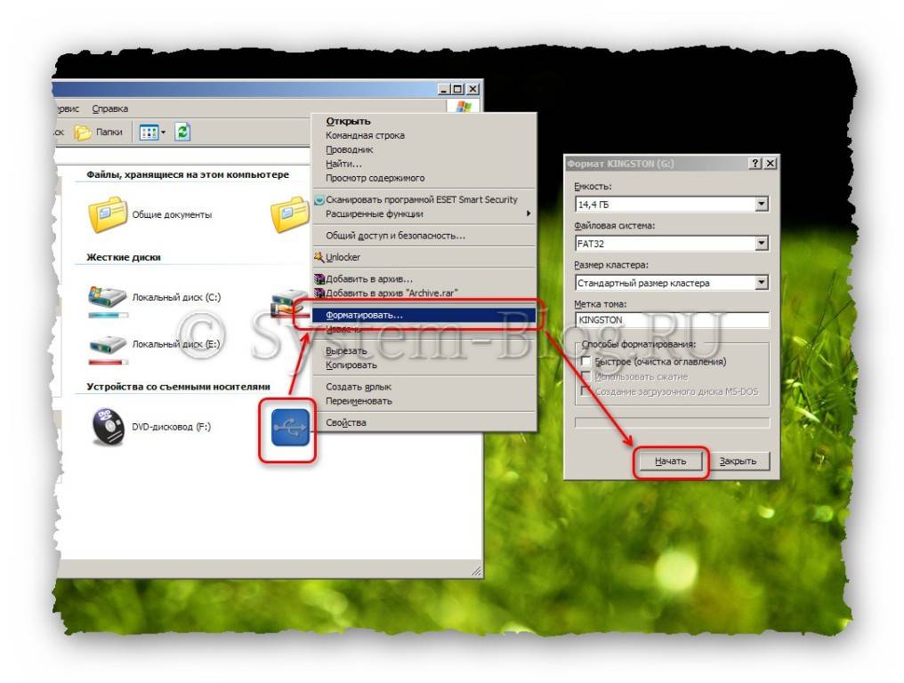 Как лечить? Есть два способа – один надёжный, но грубый, а второй даст шанс вашим файлам. В первом случае можно просто всё отформатировать, и тогда вируса точно не будет, но все файлы будут потеряны. Чтобы отформатировать, нажмите на флешку правой кнопкой мышки, выберите «Форматировать» и нажмите кнопку «Начать» в открывшемся окне.