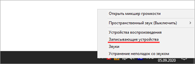 В контекстном меню выберите пункт «Записывающие устройства» или «Звуки».