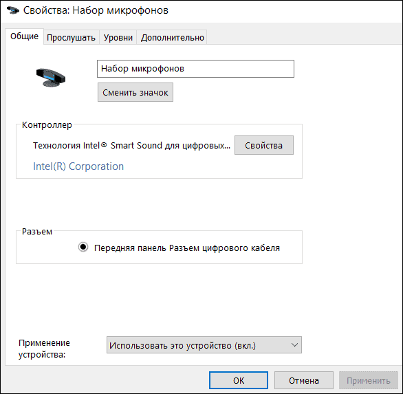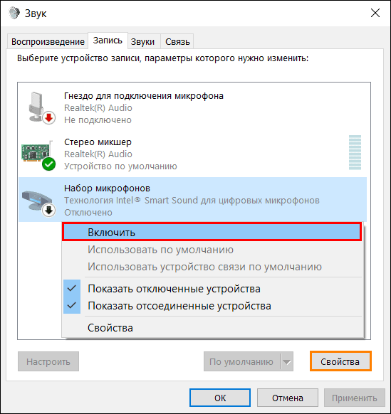 Если микрофон не задействован, включите его в контекстном меню. Если все нормально, откройте элемент двойным кликом левой кнопки мыши.