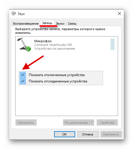 Если устройство успешно определилось, на вкладке «Запись» будет активна иконка микрофона.