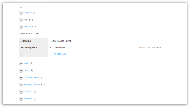 Далее пройдите на страницу найденного ноутбука. Здесь будет также предложение скачать драйвера для данной модели ноутбука. Скачайте аудио драйвера и установите на ноутбуке (для микрофона нет отдельно взятого драйвера, драйвер обеспечивает стабильную работу звуковой карты, которая выводит звук на колонки, а также записывает звук с микрофона) и перезагрузите его.