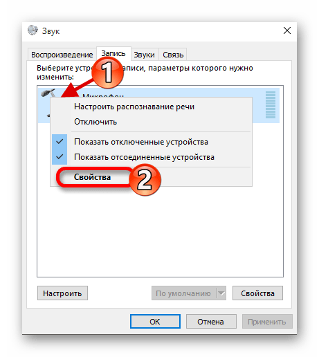 - В «Записывающих устройствах» в контекстном меню «Микрофона» выберите «Свойства».