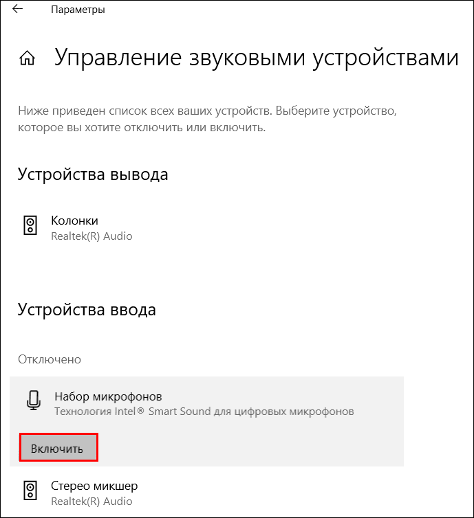 Итак, если компьютер не видит микрофон – в поле «Выберите устройство ввода» есть только запись о том, что оно не найдено, щелкните ссылку «Управление звуковыми устройствами» (элемент в зеленой рамке на скриншоте выше). В следующем окне отобразится список всех средств ввода звука, установленных на ПК, в том числе отключенных. Если среди них есть интересующий вас микрофон, выделите его кликом мыши и нажмите «Включить».