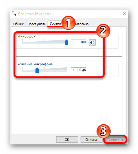 Во вкладке «Уровни» выставьте «Микрофон» и «Уровни…» выше нуля и примените настройки.