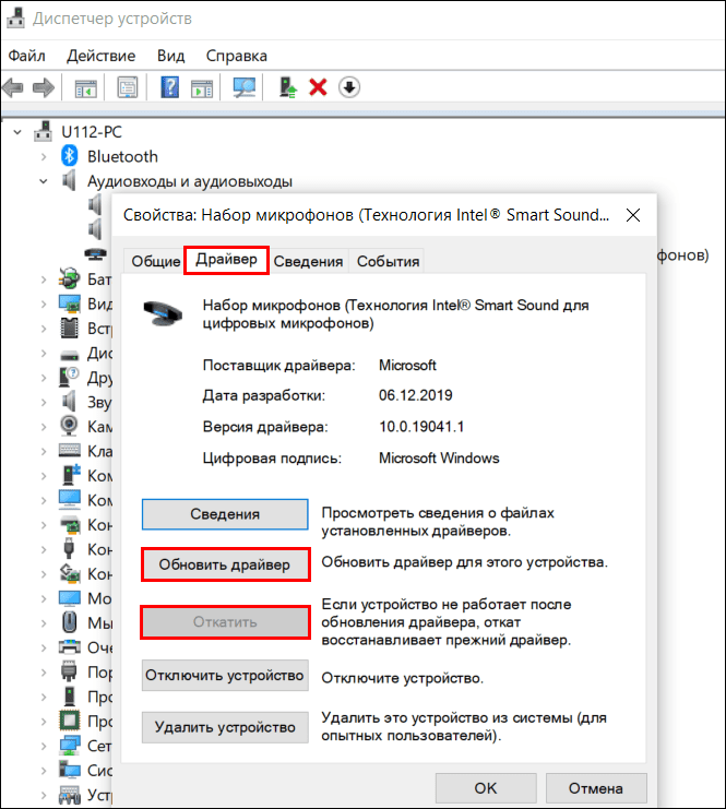 Как переустановить драйверы звукового адаптера и микрофона через «Диспетчер устройств», вы уже знаете. При помощи этого же инструмента их можно обновить или откатить на предыдущую версию. Кнопки вызова функций обновления / отката находятся в окне свойств устройства на вкладке «Драйвер». Чтобы открыть свойства, достаточно дважды кликнуть по имени элемента в списке оборудования.