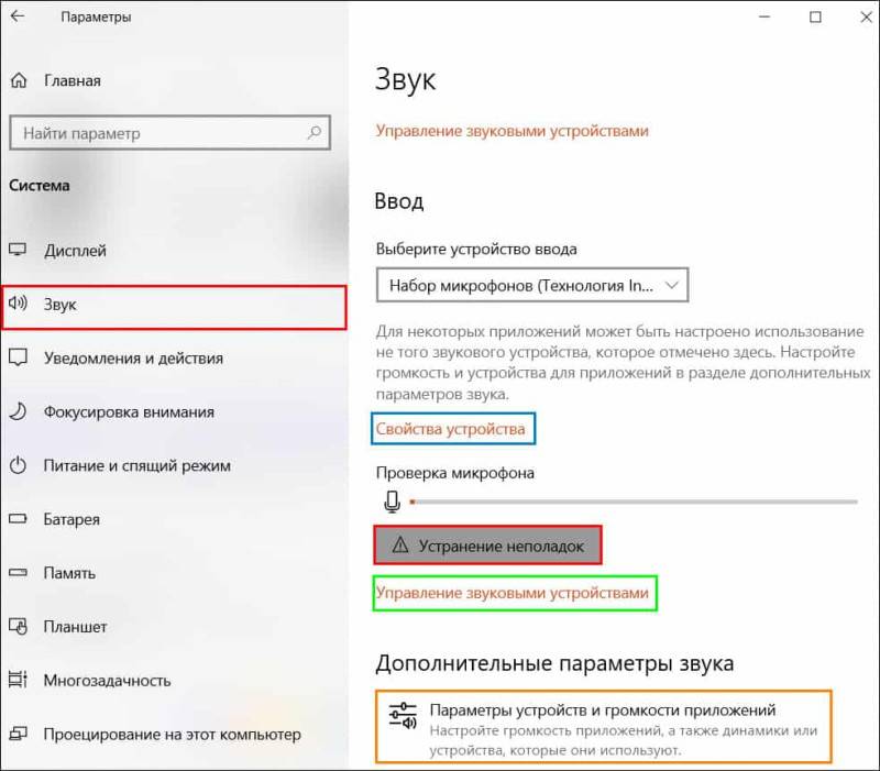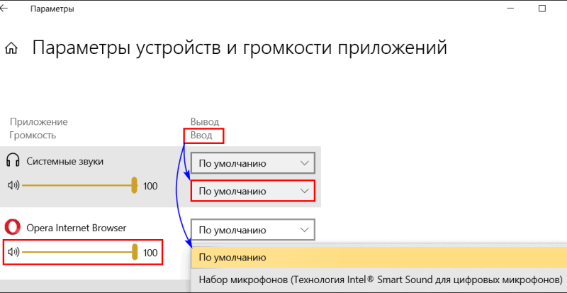 При неполадках в работе микрофона только в отдельных программах снова вернитесь в первое окно и кликните «Параметры устройств и громкости приложений» (в оранжевой рамке на скриншоте). Проверьте, какой микрофон использует интересующая вас программа (устройства ввода звука находятся в нижних выпадающих списках) и отрегулируйте его громкость.