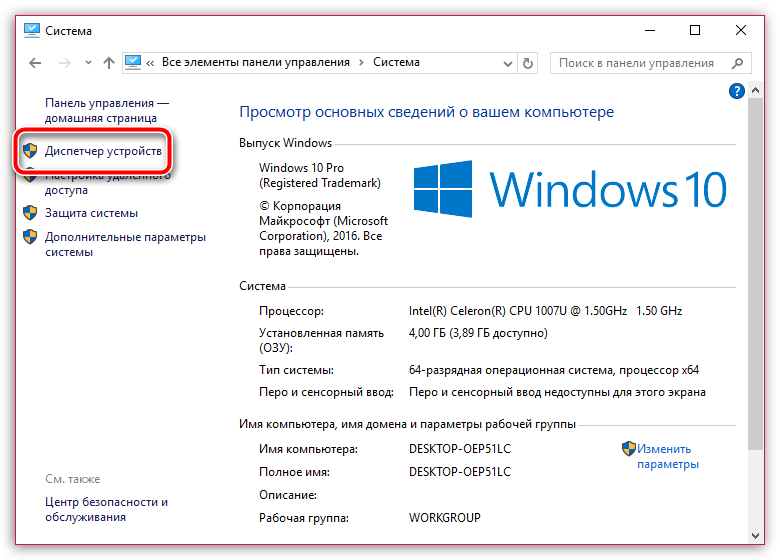 Затем в левой колонке нажмите на пункт «Диспетчер устройств»