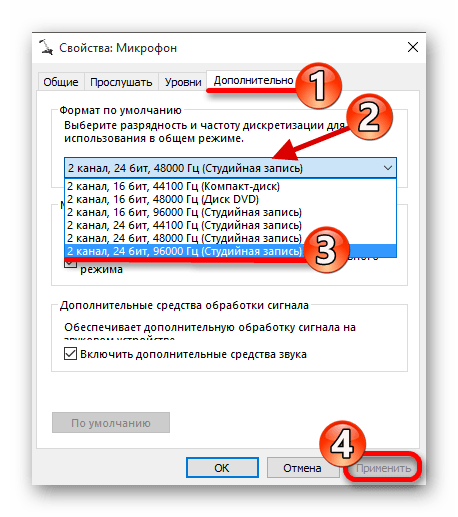 Перейдите к «Дополнительно» и в «Формате по умолчанию» переключите «2-канальный, 16-битный, 96000 Гц (студийное качество)».